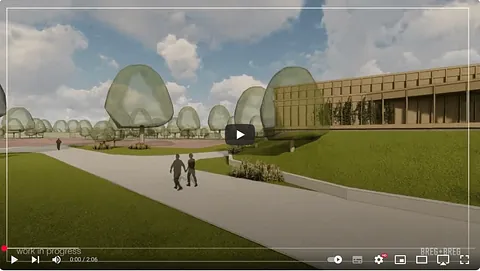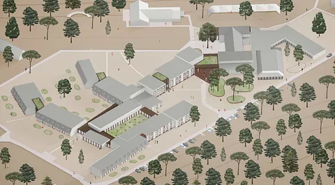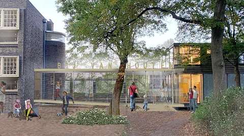 De bestaande markante gebouwen worden getransformeerd naar wijkcentrum. Dit transparante entreegebouw vormt de ingang en verbinding tussen beide bouwdelen.